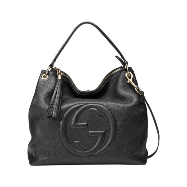 This black Gucci bag exudes luxury with its beautiful leather and gold-toned hardware. The famous interlocking GG logo is displayed proudly on the front. With a zipper pocket and two open pockets befitting of a phone, you’ll have space to organize what you need to bring with you.