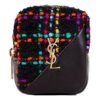The Saint Laurent Jamie Cube Charm is a stylish addition to your keyring. The tweed and leather design of this charm are enhanced by the bold magenta color. Perfect for ladies on the go who like to keep the bare essentials at hand. This is an elegant way to carry your id and credit cards. Features gold-tone hardware, YSL logo emblem detail, zip closure and snap hook.