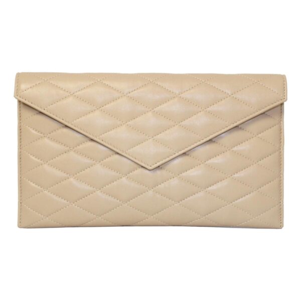 This classic Sade clutch from Saint Laurent is crafted from beige quilted leather in an envelope silhouette with a snap enclosure. The flap-top opens to a black grosgrain-lined interior compartment with two credit card slots. Go for a timeless look with this minimal and refined piece from Saint Laurent.